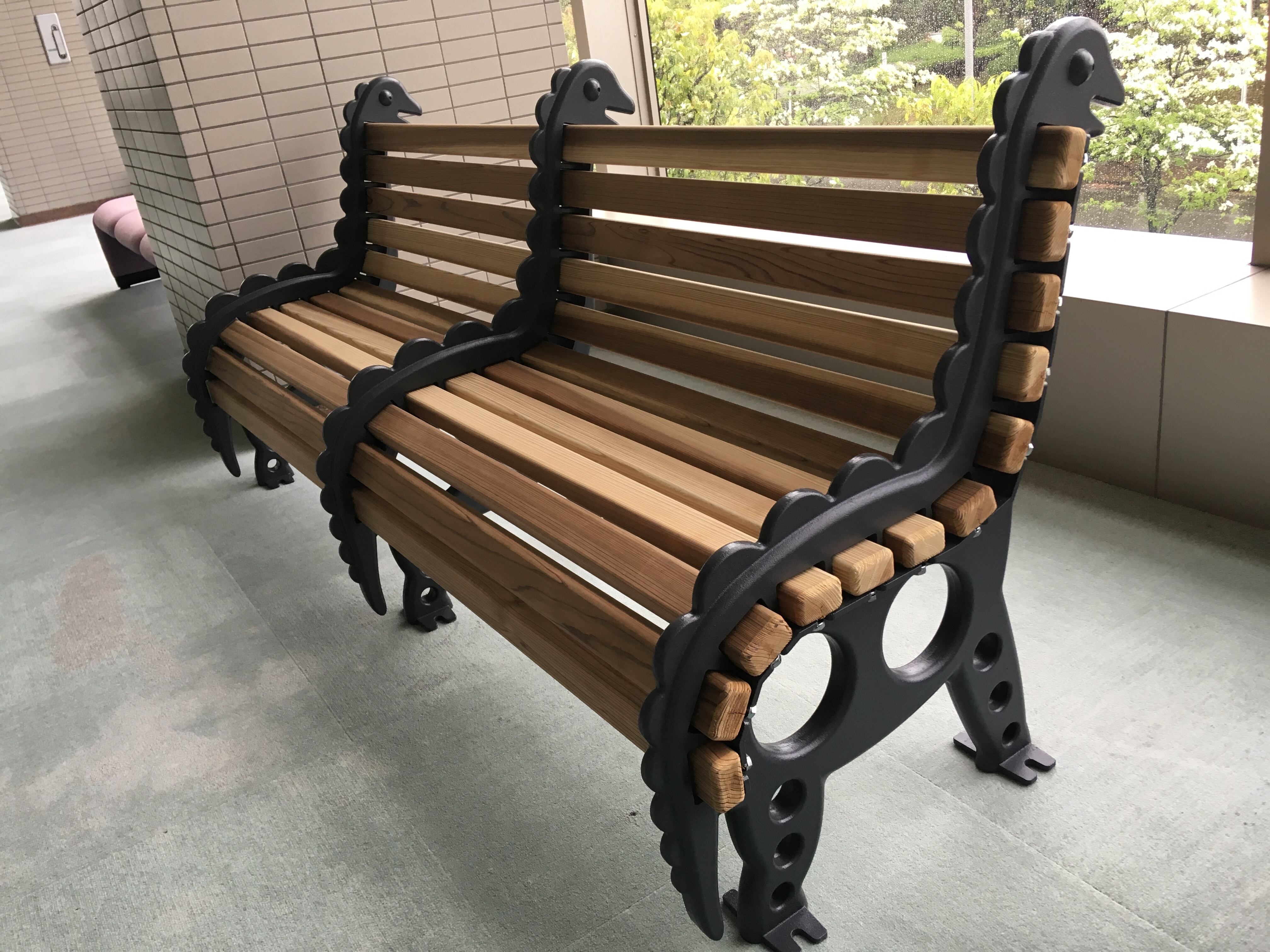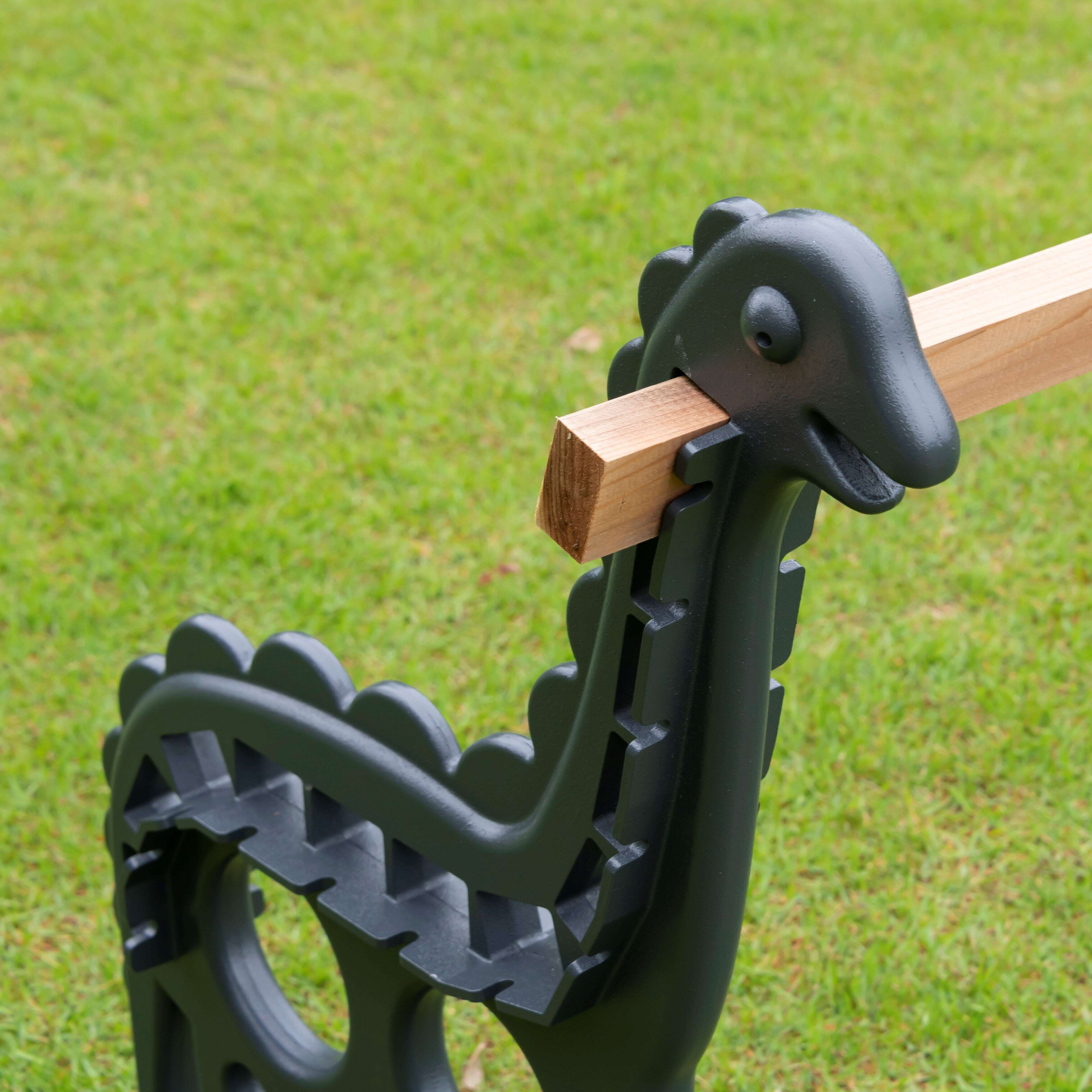 福井県は恐竜の化石が多数発掘されたことから「恐竜王国」と呼ばれています。福井発、フレームを恐竜モチーフにしたウッドベンチは、横から見ると可愛さ満点です。